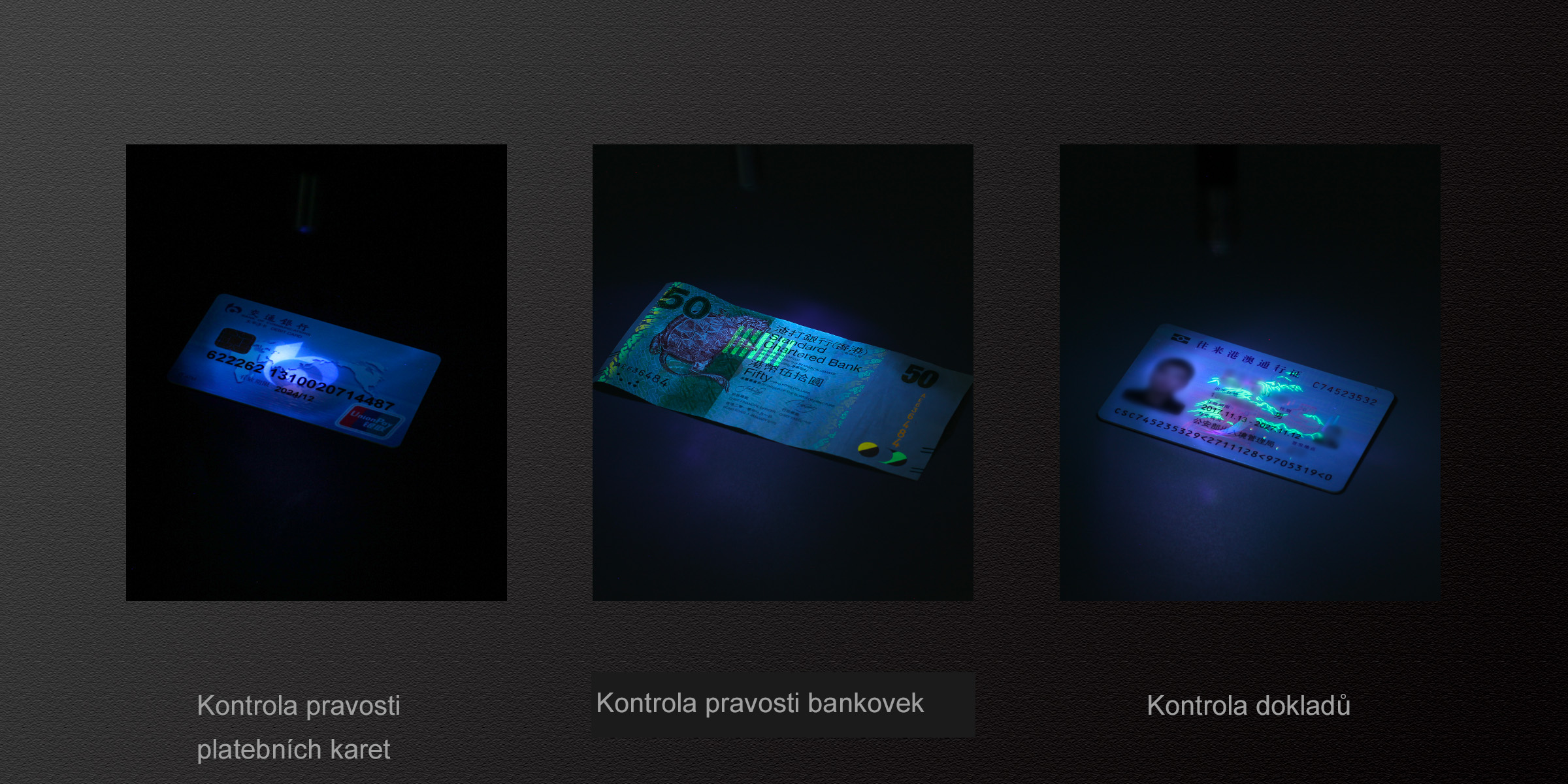 - Valódiság ellenőrzése: A bankjegyek, igazolványok, bankkártyák és más értéktárgyak olyan biztonsági elemekkel rendelkeznek, amelyek különösen UV-fény alatt láthatók.