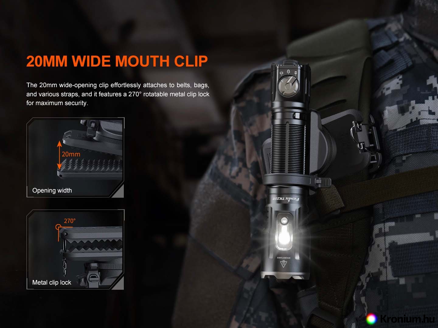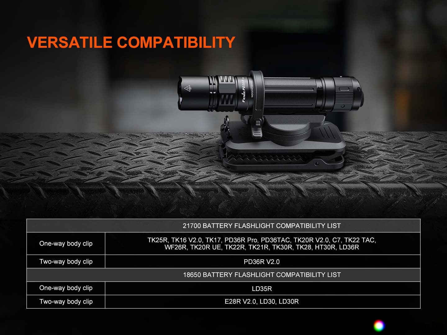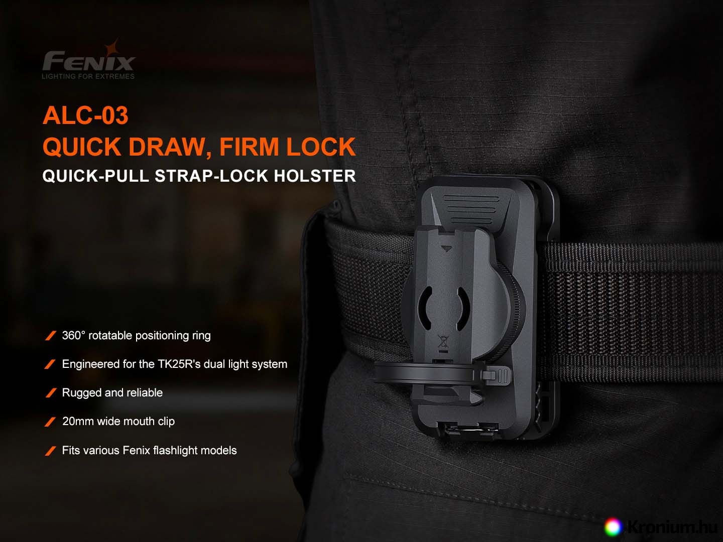 A Fenix ALC-03 forgatható tartó a lámpák övcsipesz segítségével történő rögzítésére szolgál övre, hátizsák pántjára és hasonlókra. A tartóban a lámpát egy gumigyűrű is rögzíti. Olyan klipsszel ellátott zseblámpák rögzítésére használható, mint a Fenix PD36R PRO, PD36R ACE, PD35R ACE, TK16, TK17, TK21R és mások. A tartó egy masszív klip segítségével rögzíthető az övhöz, és egy drótrugóval tovább biztosítható. A forgatható tartónak köszönhetően a lámpa 360°-ban elforgatható.