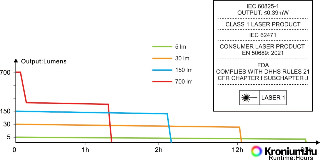 - Négy fehér fénymód: 700 lumen (1,3 óra) -> 150 lumen (2,8 óra) -> 30 lumen (12 óra) -> 5 lumen (60 óra).