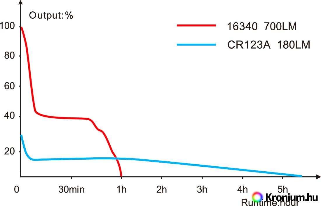 - Esetleg egy egyszer használatos CR123A lítium elem is használható, de ezzel a lámpa teljesítménye 180 lumenre csökken.