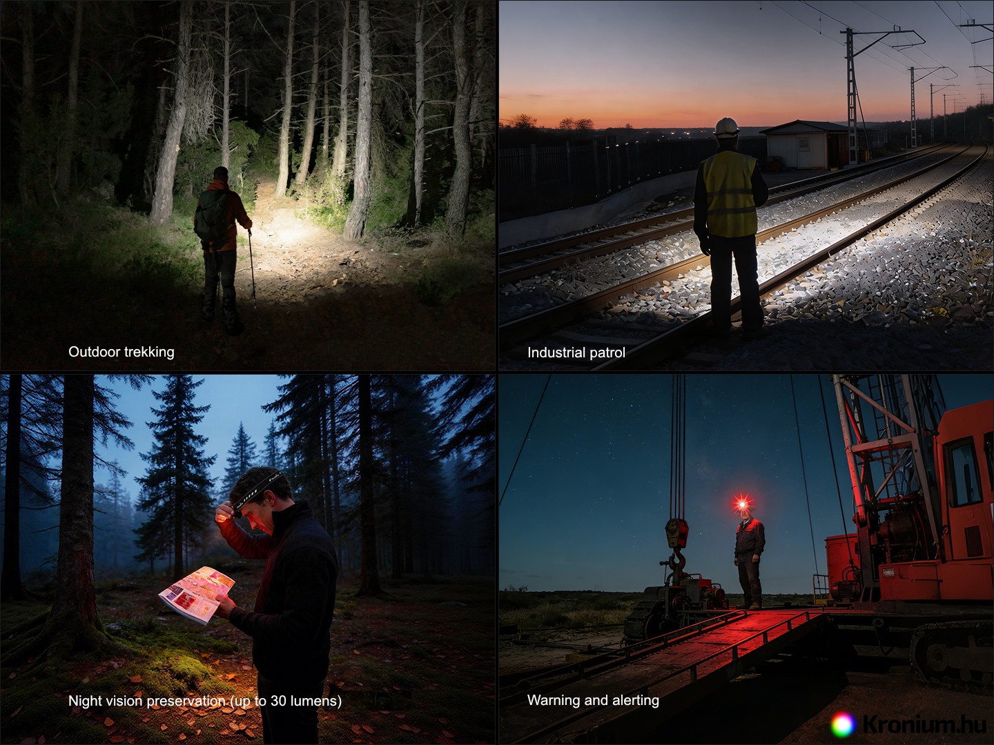 - Négy piros fény mód: 30 lumen (6,5 óra) -> 10 lumen (13,5 óra) -> 1 lumen (108 óra) -> piros villogás 10 lumen (/).