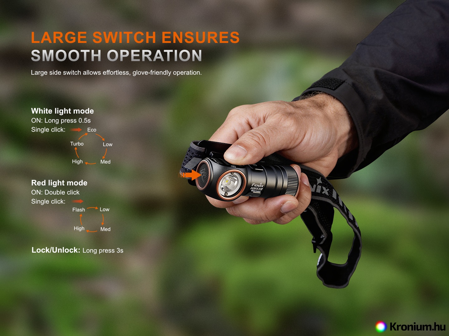 A fejlámpa lezárása a véletlen bekapcsolás ellen: Lazítsa meg a fejlámpa akkumulátorfedelét egy negyed fordulattal, ez megszakítja az elektromos érintkezést, és a fejlámpát nem lehet bekapcsolni. A gomb elektronikusan is lezárható – kikapcsolt fejlámpa mellett tartsa lenyomva a gombot 3 másodpercig. A lezárás után a lámpa pirosan villog. A feloldáshoz ismét tartsa lenyomva a gombot 3 másodpercig.