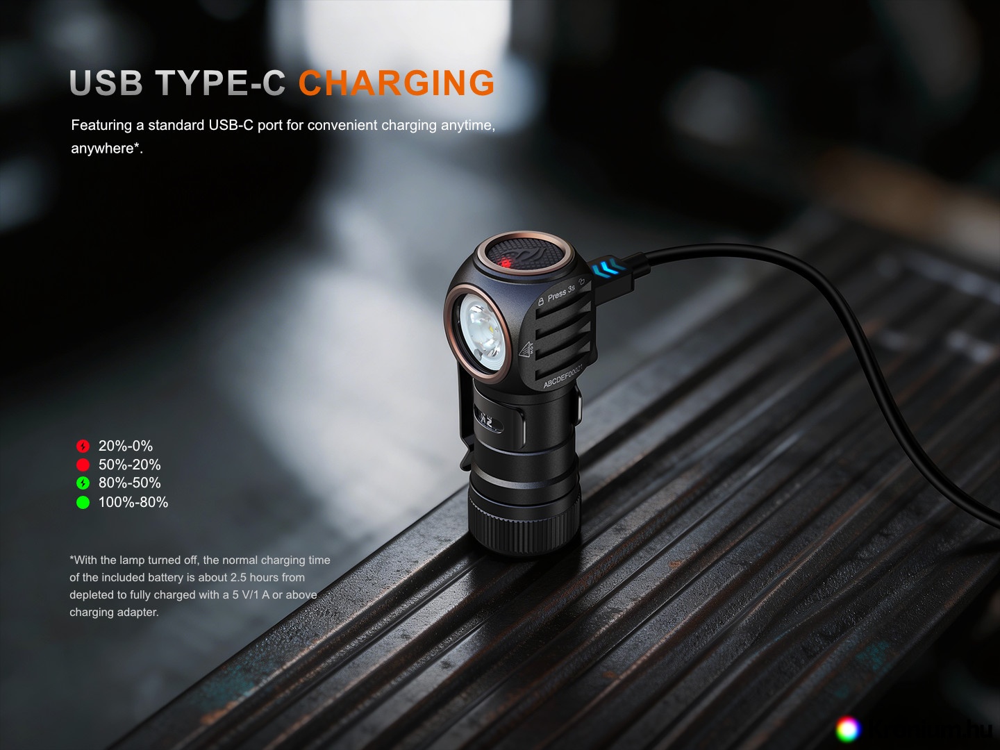 - Töltés a fejlámpa oldalán található USB-C csatlakozón keresztül, egy teljesen lemerült akkumulátor töltési ideje kb. 2,5 óra.