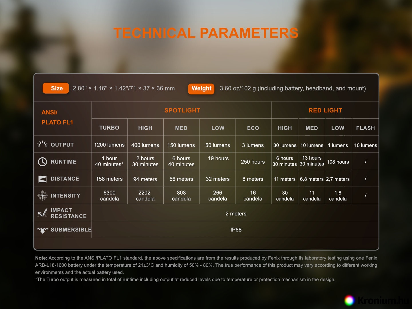 A lámpa minden paraméterét (fényáram, akkumulátor üzemidő, vízállóság, hatótáv és ütésállóság) az ANSI/NEMA FL 1-2009 szabvánnyal összhangban mérték.