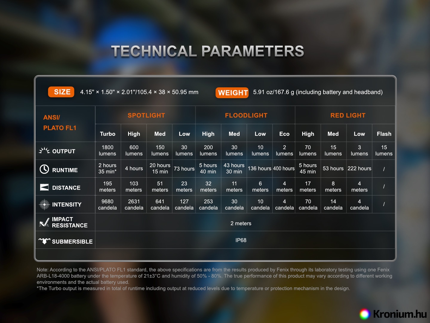 A lámpa minden paramétere (fényáram, akkumulátor üzemidő, vízállóság, hatótávolság és ütésállóság) az ANSI/PLATO FL1 szabványnak megfelelően lett mérve.