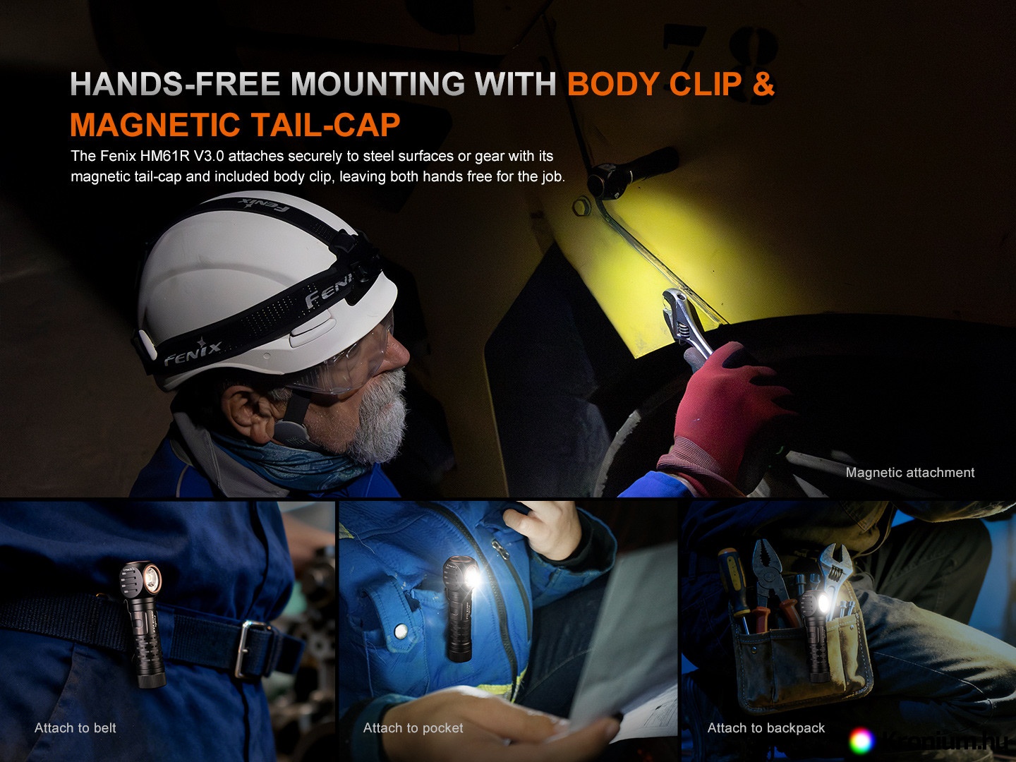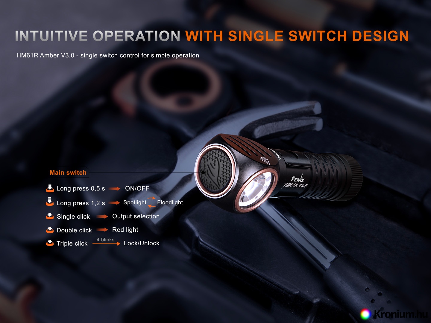 A fejlámpa végkupakja mágneses, így könnyen rögzíthető bármilyen vasfelületre. A HM61R Amber V3.0 mindkét reflektorhoz négy világítási móddal rendelkezik, ami lehetővé teszi a választást a nagy teljesítmény és a hosszú üzemidő között (akár 400 óra). A lámpa digitálisan vezérelt állandó árammal működik, garantálva az állandó fényteljesítményt még az akkumulátorok feszültségének csökkenésekor is (fokozatos lemerülésük során).