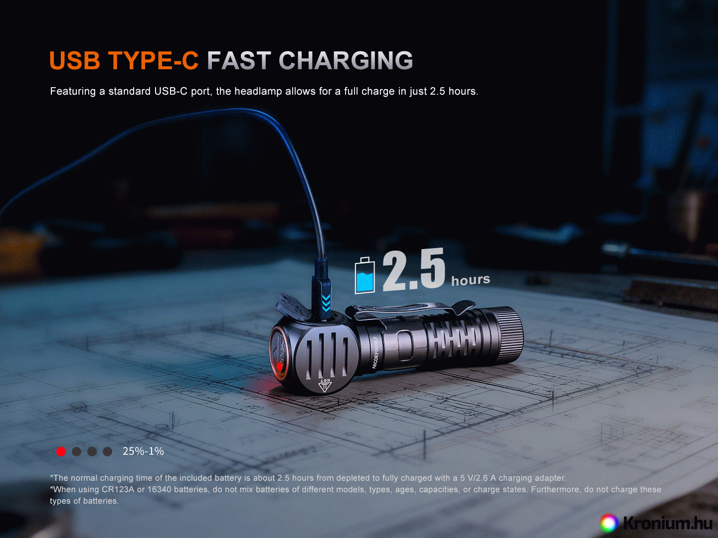 - A szokásos töltési idő 2,5 óra 5 V/2 A USB forrással teljesen lemerült fejlámpa esetén. Töltés közben a fejlámpa használható, de a töltési idő meghosszabbodik, és az elérhető teljesítménymódok az akkumulátor aktuális töltöttségi szintjétől függenek.