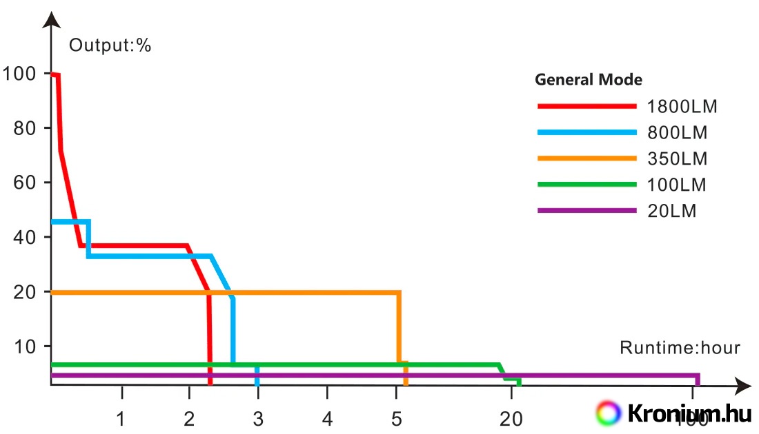 - Hat fő fehér fény mód: 1800 lumen (2,3 óra) -> 800 lumen (3 óra) -> 350 lumen (5,5 óra) -> 100 lumen (22,6 óra) -> 20 lumen (101,9 óra) -> stroboszkóp 1800 lumen.