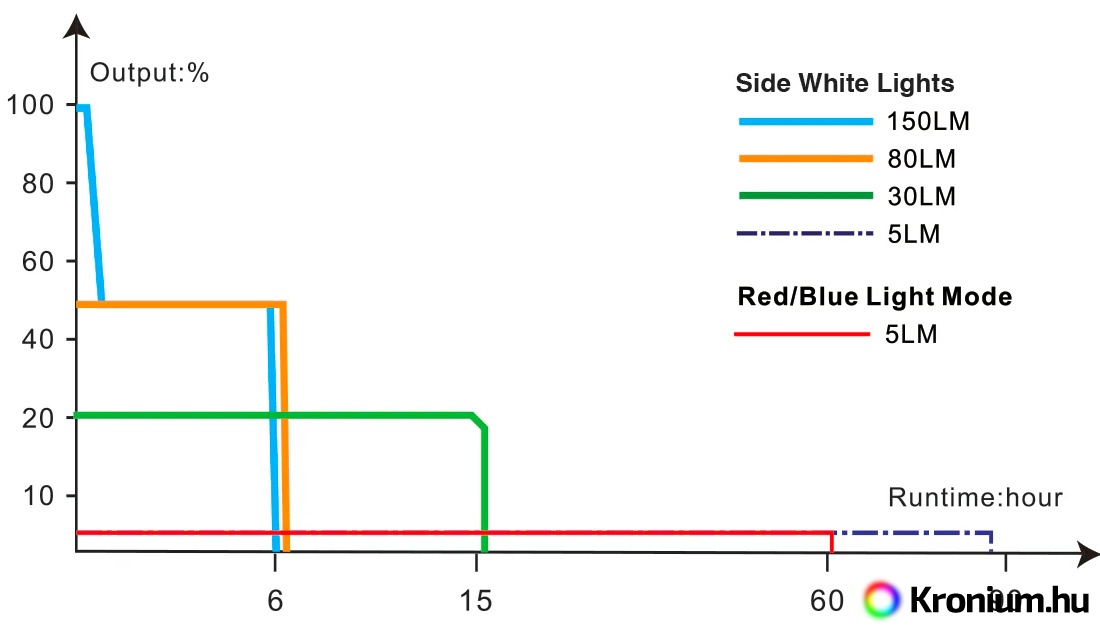 - Négy oldalsó fehér fény mód: 150 lumen kétoldalas (6 óra) -> 80 lumen kétoldalas (6,2 óra) -> 30 lumen egyoldalas (15,7 óra) -> 5 lumen egyoldalas (86,5 óra).