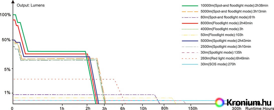 - Két villogó üzemmód (fokozatmentes szabályozás nélkül): stroboszkóp 10000 lumen (/) és SOS 30 lumen (270 óra).