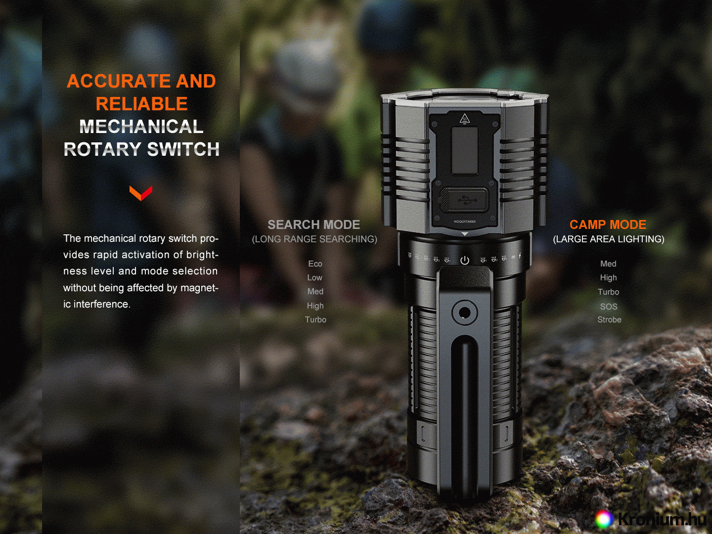 Be-/kikapcsolás és üzemmód váltás - a kereső mód a zseblámpa fején lévő vezérlőgyűrű óramutató járásával megegyező irányba forgatásával, a kemping mód a gyűrű óramutató járásával ellentétes irányú elforgatásával kapcsolható be. A gyűrűt a kiválasztott irányba forgatva a kiválasztott mód többi világítási módja kapcsolható át. A gyűrű középső helyzetbe forgatásával a lámpa ismét kikapcsol.