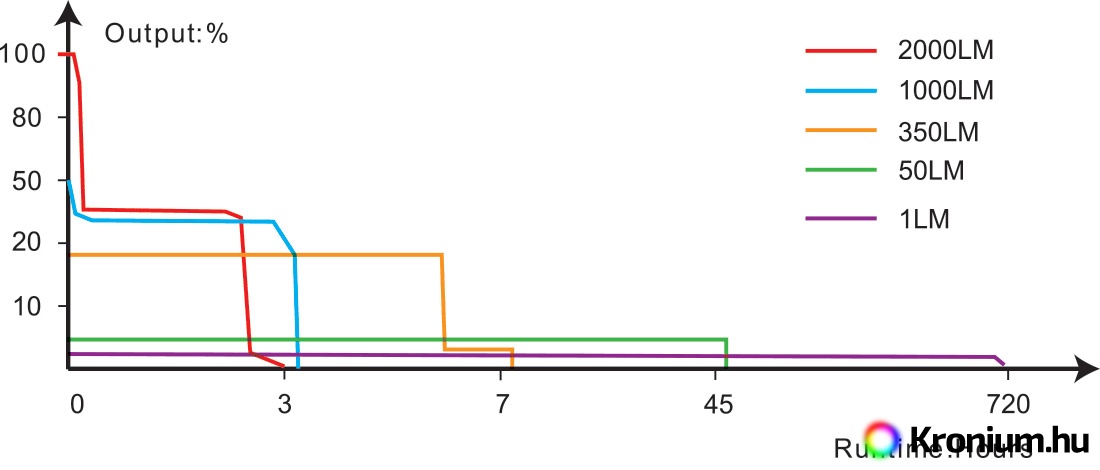 - Hét világítási mód: Turbó 2000 lumen (2 ó 50 p) – 1000 lumen (3 ó 20 p) – 350 lumen (7 ó 16 p) – 50 lumen (45 ó 24 p) – 1 lumen (720 óra) – Stroboszkóp (2000 lumen) – SOS (50 lumen).