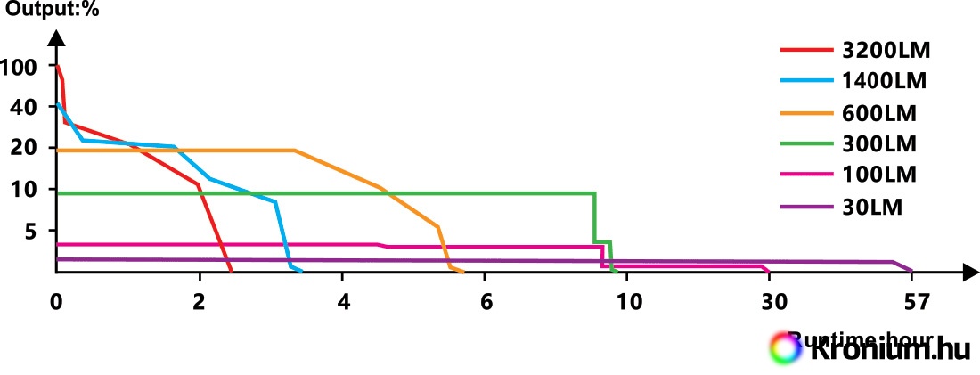 - Hat üzemmód: 3200 lumen (2,3 óra) -> 1400 lumen (3,3 óra) -> 600 lumen (5,5 óra) -> 300 lumen (9,5 óra) -> 100 lumen (30 óra) -> 30 lumen (57 óra) -> stroboszkóp (3200 lumen).