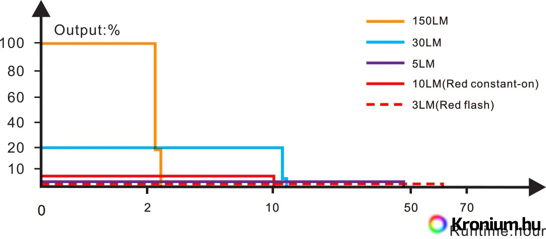 - Három fehér fénymód: 150 lumen (2,5 óra)-> 30 lumen (12,3 óra)-> 5 lumen (49 óra).