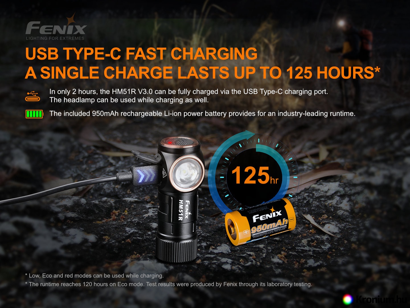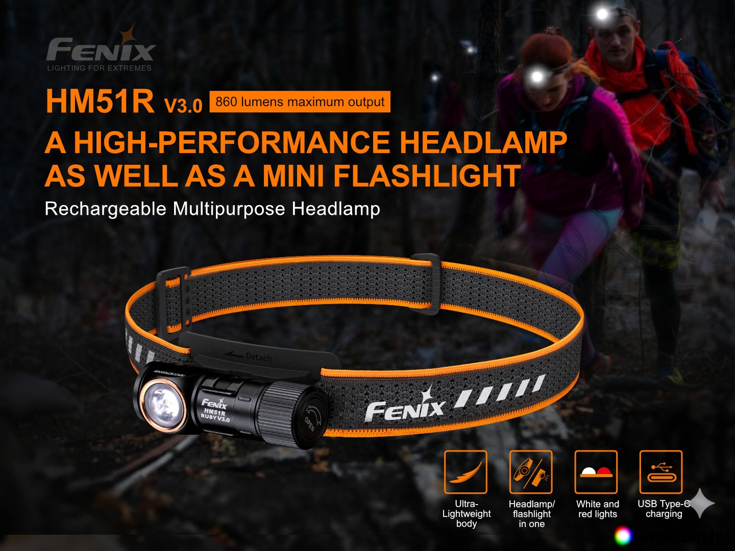 A nagyon népszerű tölthető fejlámpa harmadik generációja, a Fenix HM51R Ruby V3.0 akár 860 lumen (ANSI) fényáramú semleges fehér fényt (4500 K) kínál akár 140 méteres hatótávolsággal, emellett piros LED-ekkel is rendelkezik. Egy RCR123A típusú akkumulátor (a csomag része) táplálja, amely közvetlenül a lámpában tölthető egy modern USB-C csatlakozón keresztül, alternatívaként egyszer használatos CR123A lítium elemmel is működtethető (korlátozott, max. 150 lumen teljesítménnyel). A vezérlőgombban egy visszajelző LED is található, amelynek köszönhetően mindig tudni fogja, mikor kell feltölteni az akkumulátort. A lámpa végkupakja mágneses, így könnyen rögzíthető bármilyen vasfelületre. A HM51R kilenc különböző világítási móddal rendelkezik, amelyek lehetővé teszik a választást a nagy teljesítmény és a hosszú üzemidő (akár 125 óra) között. A lámpát digitálisan vezérelt állandó áram táplálja, hogy garantálja a folyamatos fényteljesítményt még az akkumulátor feszültségének csökkenésekor is (fokozatos lemerülés esetén).