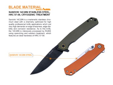 Ruike késpengék Sandvik 14C28N martenzites krómacélból készülnek, optimalizált kémiai összetétellel és kristályszerkezettel. A Ruike termékek megfelelnek a professzionális késekkel szemben elvárt követelményeknek, mint például a penge keménysége, csiszolási tartósság, élesség és korrózióállóság.