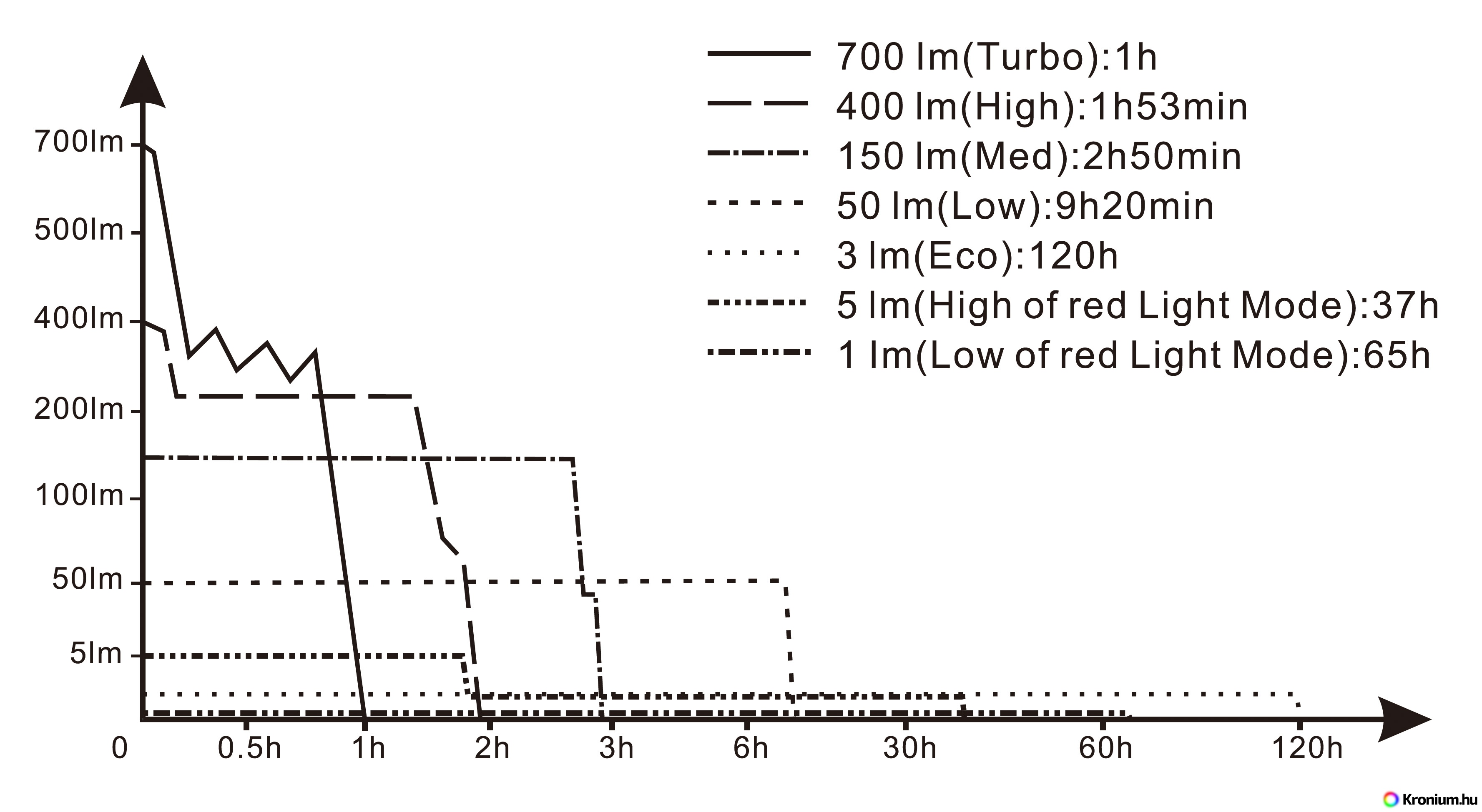 - Öt fehérfény-üzemmód: 700 lumen (1 óra) -> 400 lumen (1,8 óra) -> 150 lumen (2,8 óra) -> 50 lumen (9,3 óra) -> 3 lumen (120 óra)