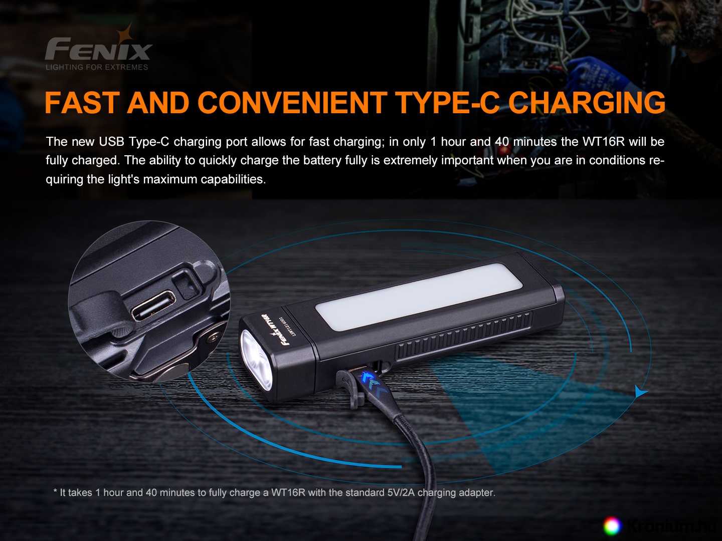 A Fenix WT16R egy többcélú, újratölthető lámpa távoli reflektorral és egy oldalsó széles lámpával, amely akár 300 lumen fényerővel rendelkezik. A fényforrás a vezető reflektorban egy pár Cree XP-E2 LED, az oldalsó lámpa több COB LED-et tartalmaz. Ez az oldalsó lámpa széles fénykúppal és egyenletes intenzitással rendelkezik, amely nemcsak a munkahely megvilágítására ideális, hanem sárga villogó figyelmeztető funkcióval is rendelkezik. A Fenix WT16R lámpa egy erős acélcsipesszel is rendelkezik, hogy könnyen hordozható legyen az övén vagy zsebében. Két erős mágnessel is fel van szerelve, az egyik az oldalán, a másik az alján található. A lámpa így két különböző helyzetben könnyen rögzíthető egy vasfelületre. A lámpát variálhatóságával kifejezetten munkahelyi használatra tervezték, de otthon és kempingezéskor is nagyszerű szolgálatot tesz.