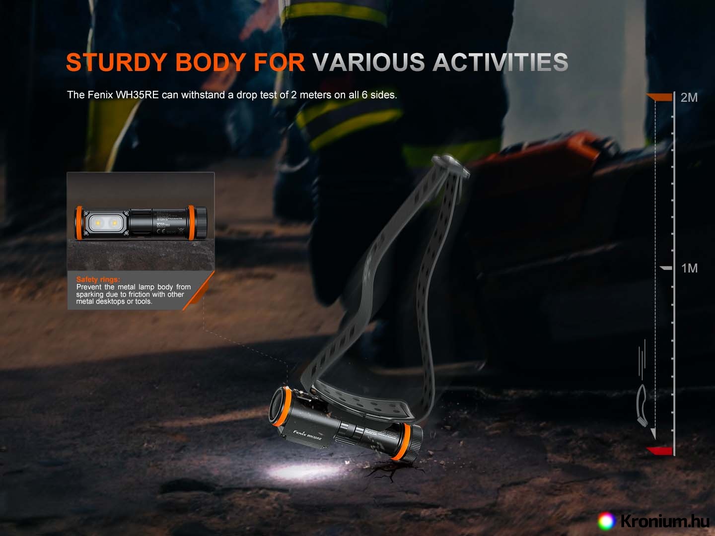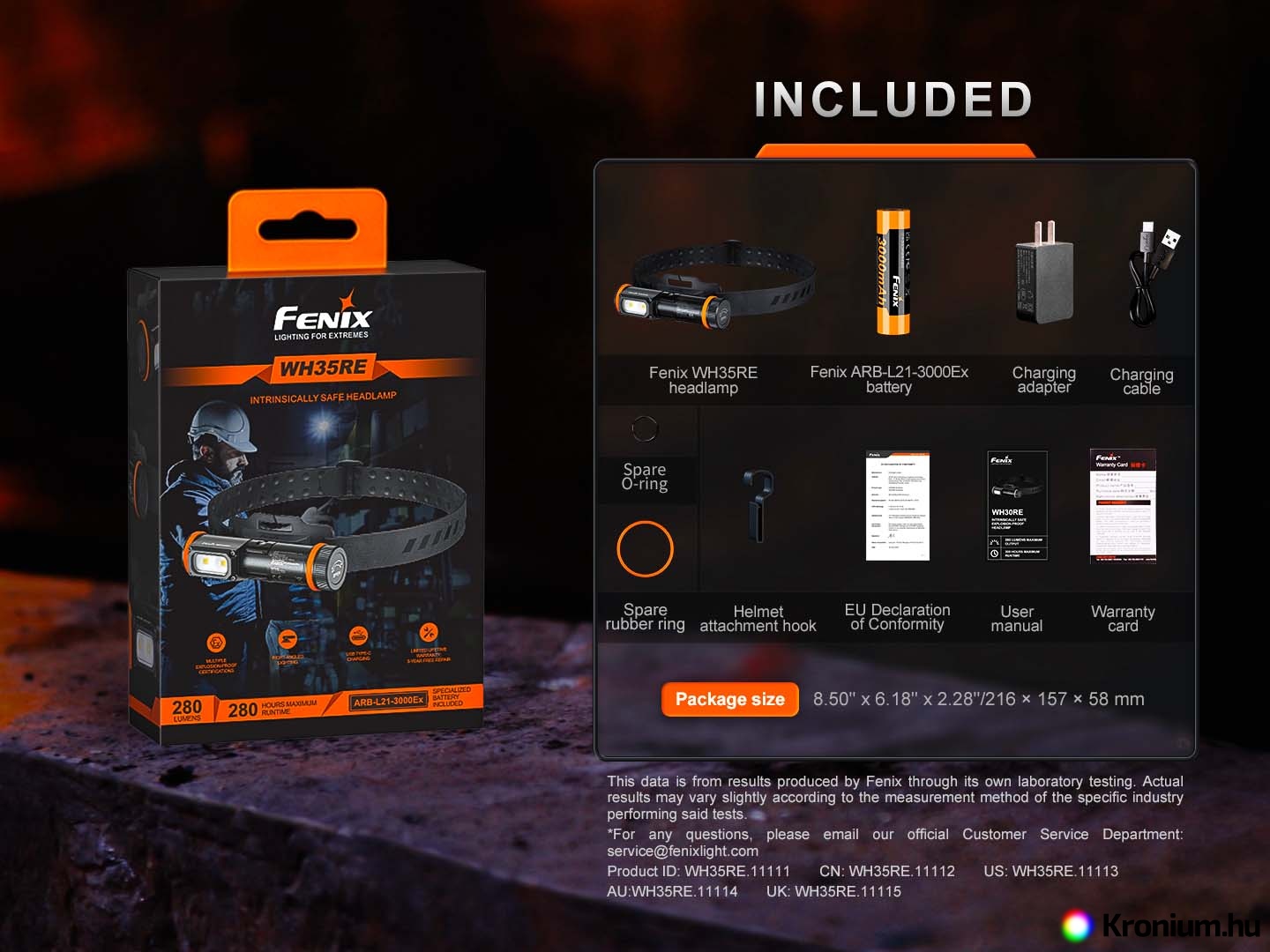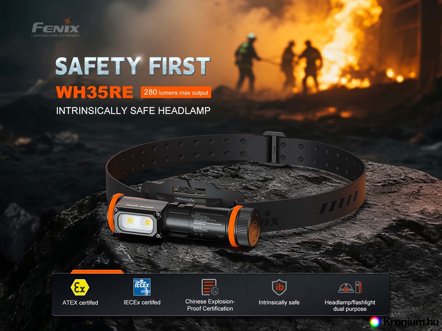 A Fenix WH35RE egy biztonságos munkavégzésre szánt fejlámpa robbanásveszélyes környezetbe, különösen a robbanásveszélyes területekre tervezve, kivéve a földalatti bányákat. Rendelkezik ATEX/IECex tanúsítvánnyal. Maximális teljesítménye 280 lumen, és egy speciálisan módosított ARB-L21-3000Ex Li-ion akkumulátor (tartozék) táplálja, 3000 mAh kapacitással, amely közvetlenül a lámpában tölthető modern USB-C csatlakozón keresztül. A fejlámpa praktikusságát növeli az a lehetőség, hogy a lámpát kivesszük a fejpántból, és zseblámpaként vagy munkahelyi lámpaként is használhatjuk. Ezenkívül a fejlámpa egy levehető acélcsipesszel van ellátva, így könnyedén rögzíthető zsebre vagy pántra. Nagy kapcsolója egyszerű és precíz működést tesz lehetővé – még kesztyűben is.