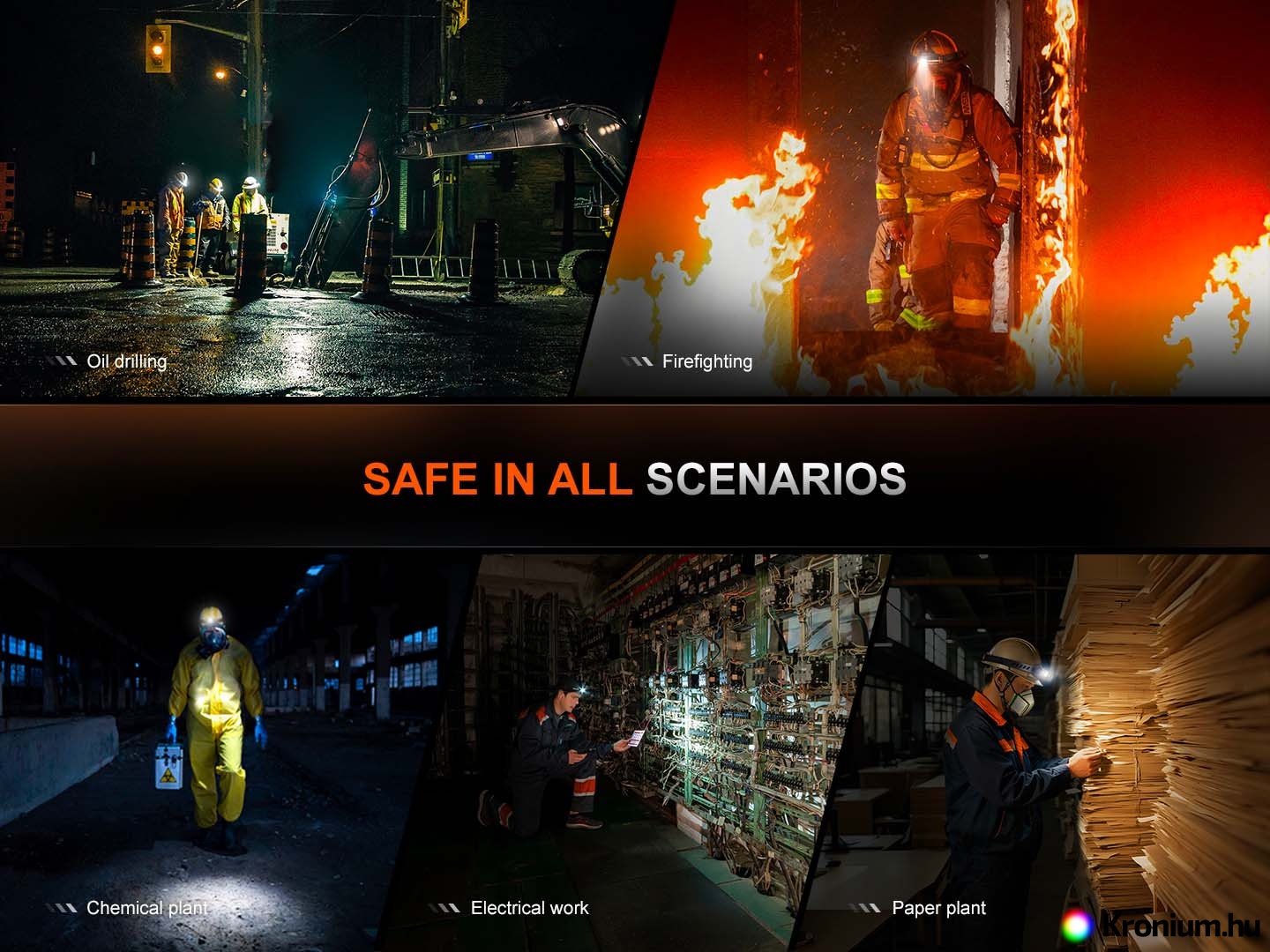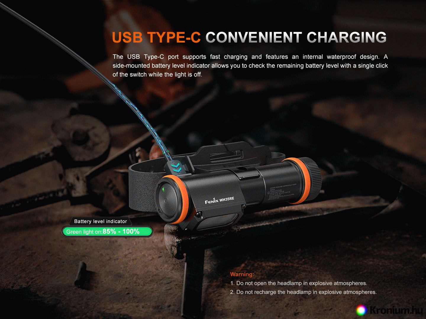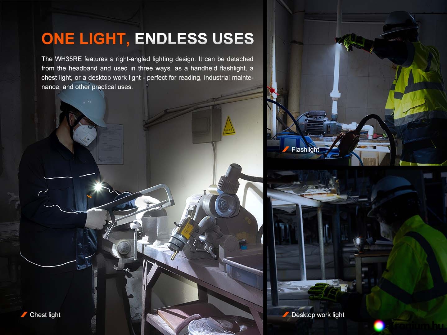 A Fenix WH35RE egy biztonságos munkavégzésre szánt fejlámpa robbanásveszélyes környezetbe, különösen a robbanásveszélyes területekre tervezve, kivéve a földalatti bányákat. Rendelkezik ATEX/IECex tanúsítvánnyal. Maximális teljesítménye 280 lumen, és egy speciálisan módosított ARB-L21-3000Ex Li-ion akkumulátor (tartozék) táplálja, 3000 mAh kapacitással, amely közvetlenül a lámpában tölthető modern USB-C csatlakozón keresztül. A fejlámpa praktikusságát növeli az a lehetőség, hogy a lámpát kivesszük a fejpántból, és zseblámpaként vagy munkahelyi lámpaként is használhatjuk. Ezenkívül a fejlámpa egy levehető acélcsipesszel van ellátva, így könnyedén rögzíthető zsebre vagy pántra. Nagy kapcsolója egyszerű és precíz működést tesz lehetővé – még kesztyűben is.