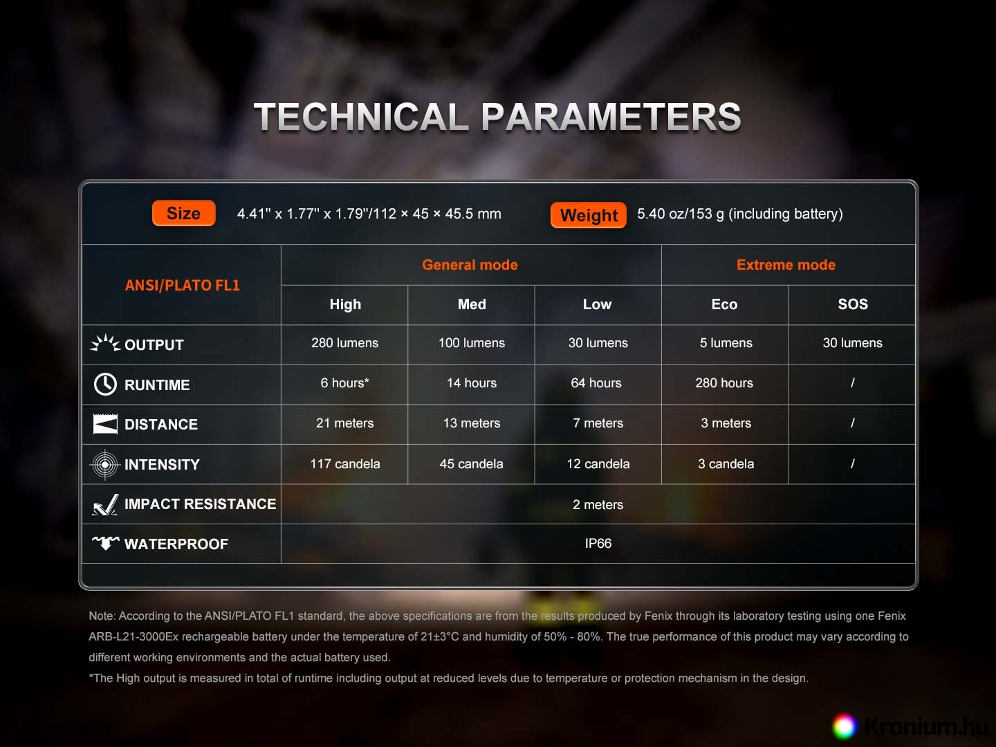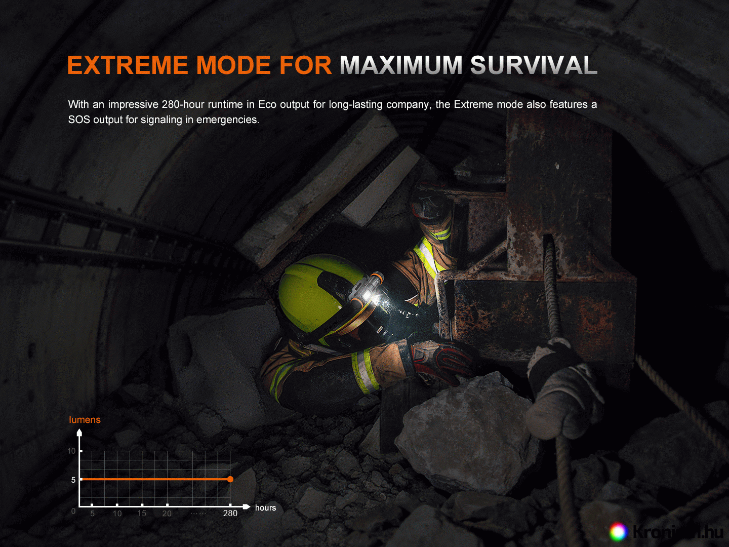 - Öt fehér fényű üzemmód: 280 lumen (6 óra) -> 100 lumen (14 óra) -> 30 lumen (64 óra) -> 5 lumen (280 óra) -> SOS 30 lumen.