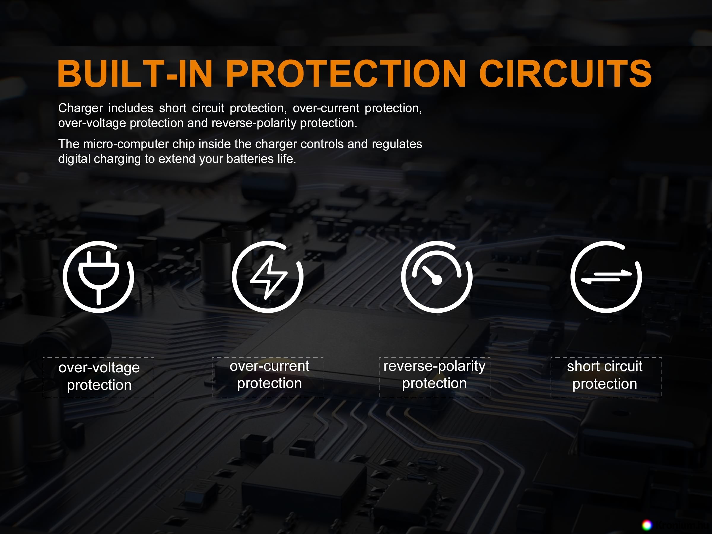 - Védelem az elemek fordított behelyezése, rövidzárlat és túltöltés ellen.